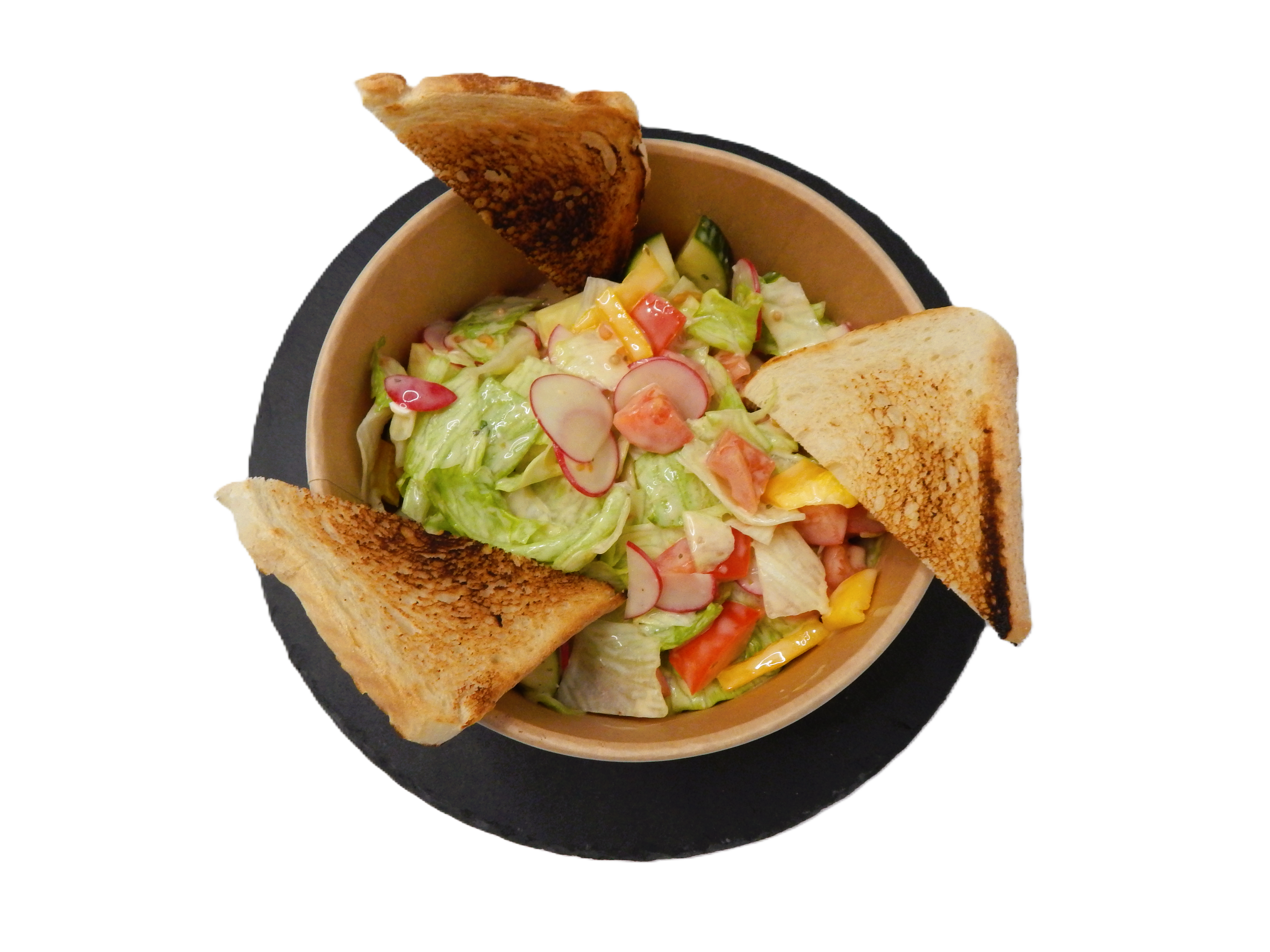Svieži zeleninový šalát s ľadovým šalátom, paprikou, paradajkou, uhorkou a redkvičkou, doplnený francúzskym dresingom a toastmi.